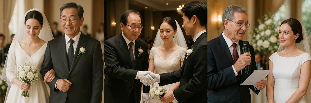 빙부는 말이 없습니다. 하지만 누구보다 복잡한 감정을 안고 앉아 있는 사람입니다. 축사 중에 목소리가 떨리는 순간, 입꼬리는 웃고 있지만 눈빛은 촉촉한 그 표정에서, 우리는 빙부가 어떤 마음인지 어렴풋이 짐작하게 됩니다. ‘딸아, 잘 살아라’라는 말조차 삼킨 채 조용히 눈빛으로 보내는 마지막 인사. 그것이 바로 빙부라는 자리입니다.