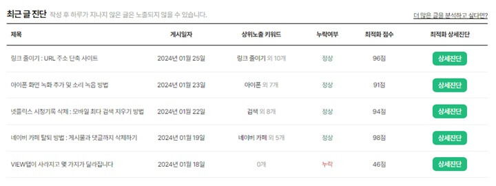 블로그 진단 기능은 정말 유용합니다. 내가 작성한 포스팅의 게시일자, 상위노출 키워드, 누락여부, 최적화 점수 등을 보여주고 이와 관련한 상세진단까지 확인할 수 있습니다.