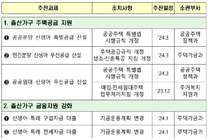 1. 출산가구 주택공급 -공공분양 신생아 특별공급 신설 -민간분양 신생아 우선공급 신설 -공공임대 신생아 우선공급 신설 2. 출산가구 금융지원 -신생아 특례 구입자금 대출 도입 -신생아 특례 전세자금 대출 도입 3. 청약제도 개선 -공공분양 소득기준 완화 -부부개별 청약 허용 등 청약기회 확대 -청년특공(공공지원민간임대) 혼인규제 개선 |