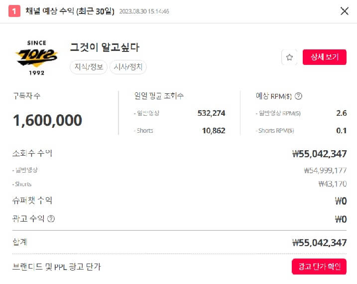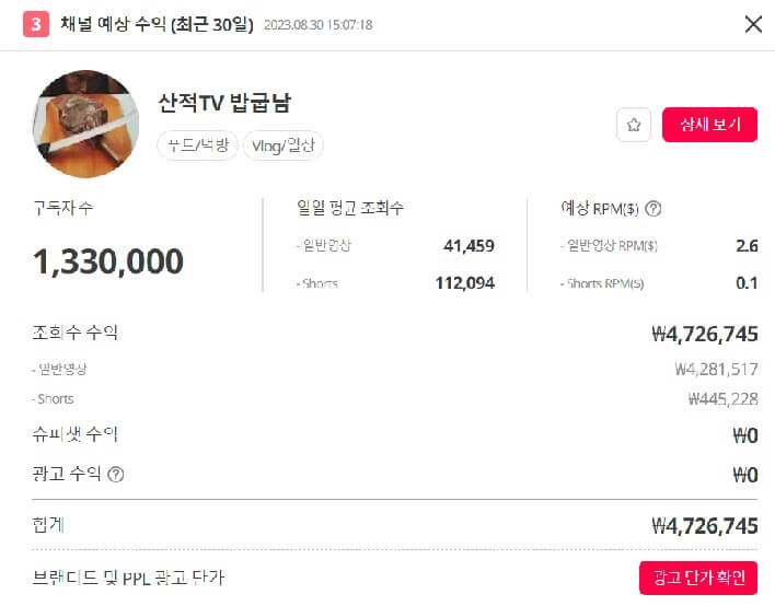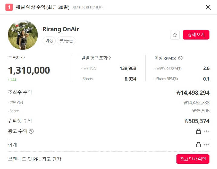 유튜브 수익계산기 블링(Vling)의 가장 큰 장점은 채널명 또는 채널 URL 등을 조회하면 최근 30일 채널 예상 수익을 한눈에 확인할수 있다는 점입니다. 현재기준 구독자수, 일일 평균 조회수(일반영상, shorts 수익), 예상 *RPM($), 슈퍼챗 수익, 광고수익(최근 30일 광고 영상 수 x 광고 단가 평균), 총합계 조회수 수익 및 광고 단가 그리고 조회 간 채널과 유사한 유튜브 채널도 동시에 뿌려줍니다. 위 항목들을 무료로 확인이 가능합니다. 내가 구독한 채널이나 평소 궁금했던 유투버의 수익을 확인하는데 참고가 될 수 있습니다. 하지만 어디까지나 실제 유튜버들이 만들어내는 정확한 수익이라고 할 수는 없고 추정치임을 참고하시기 바랍니다.