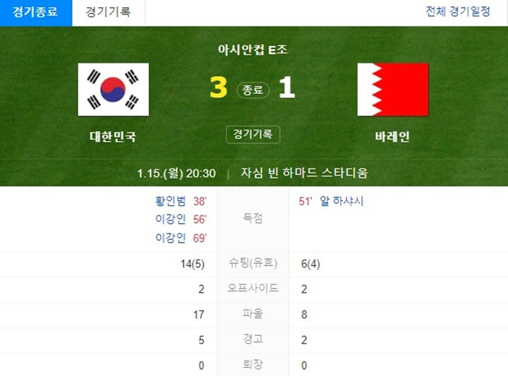 바레인은 전의를 상실했고 후반 시간이 흘러가도 공격의 의지를 보이지 못하고 경기는 3-1 대한민국 승리로 막을 내렸습니다. 원더골 2골을 일궈낸 이강인은 최근 매치 6경기에서 6골을 일궈내는 기염을 토했습니다. 기분좋은 1차전 승리를 이끈 대한민국 대표팀 다가오는 1월 20일 20:30(한국시간) 요르단과 조별리그 2차전을 갖습니다.