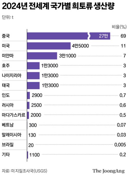 미지질조사국(USGS)에 따르면, 중국이 전세계 희토류 생산의 69%를 차지하며 독보적 1위를 유지하고 있습니다. 미국(11%), 미얀마(7%), 호주(3%)가 뒤를 잇습니다.