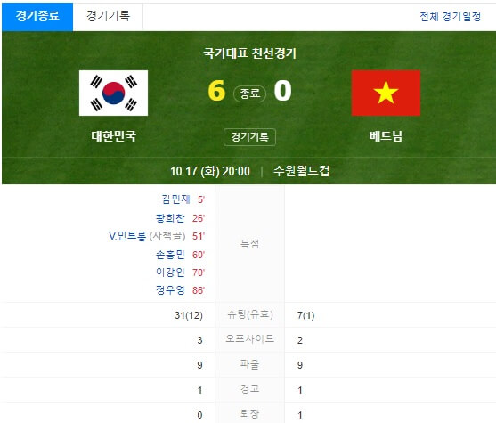 경기는 시작부터 일방적인 경기였습니다. 일단 개인기량부터 차이가 보이는 경기였습니다. 전반5분 김민재의 헤딩골을 시작으로 전반 26분 황희찬이 측면에서 파고들면서 떄린 슈팅이 골망을 갈랐습니다. 경기 흐름상 한골 정도 더 성공해 3:0을 만들었으면 하는 아쉬움이 남았습니다. 후반 60분 손흥민의 골이 터졌습니다. 전반에 안타까운 찬스를 몇 번 날렸던 터라 아쉬움이 컸을 텐데요. 역시 손흥민이었습니다. 베트남 패널티박스 근처에서 패스플레이를 주고받다가 왼쪽 깊숙이 꽂아 넣은 슛이 베트남 골망을 다시 한번 갈랐습니다 이로서 3:0 스코어가 만들어졌습니다. 후반 61분경 손흥민의 단독찬스를 반칙으로 끊어 베트남 호앙비엣안 선수가 퇴장을 당했습니다. 안 그래도 어려운 상황 베트남은 10명의 선수로 싸워야 했습니다. 후반 70분 이강인이 페널티라인에서 역동작으로 베트남선수를 제치고 정우영과 손흥민 사이로 왼발슛을 날렸고 또 골망을 갈랐습니다. 이강인은 이골로 A매치 3호 골을 달성했고 지난 튀니지전에 이어 2 경이 연속골을 기록했습니다. 이강인은 그야말로 물오른 기량을 보여주며 세대교체의 견인차 역할을 할 것으로 기대됩니다. 손흥민이 끌어왔던 A대표팀을 이제 동생 이강인이 이어받아 밀고 나가는 아름다운 모습이었습니다. 또 후반 손흥민이 조규성에 크로스 올린 볼이 베트남 선수 몸 맞고 골로 연결되어 자책골을 기록했습니다. 마지막으로 아시안게임 금메달리스트이며 대회 득점왕을 기록한 정우영 선수도 마지막 1골을 추가하며 경기를 6:0 대승으로 마무리했습니다.