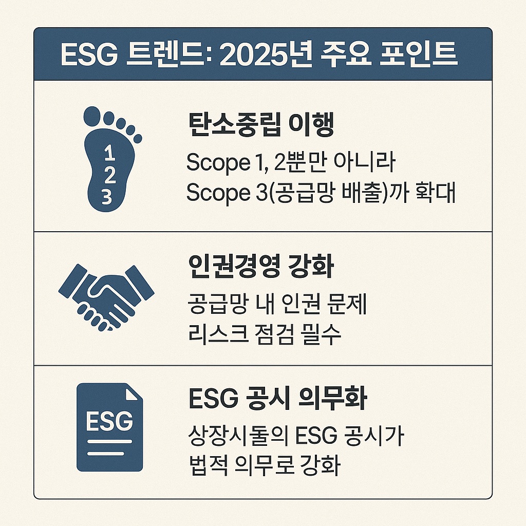 - 규제 강화(탄소중립 의무화 등)로 ESG 미준수 기업은 리스크가 커집니다.